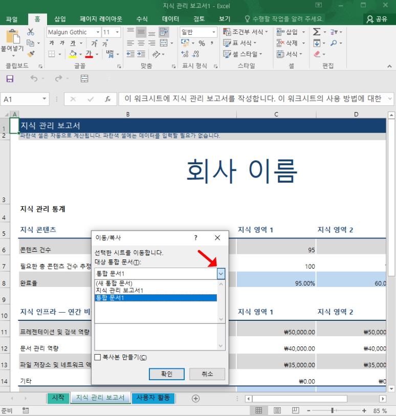 - [확인] 클릭 시 해당 파일에 시트가 복사됩니다.