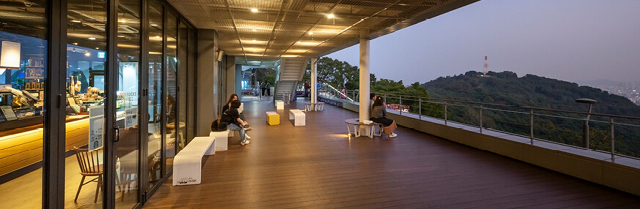 남산 서울타워 1층에 위치해 서울 시내 전경과 야경을 동시에 감상할 수 있는 스팟입니다. 유리창 너머로 단풍과 석양이 물드는 순간은 그야말로 낭만적이죠.