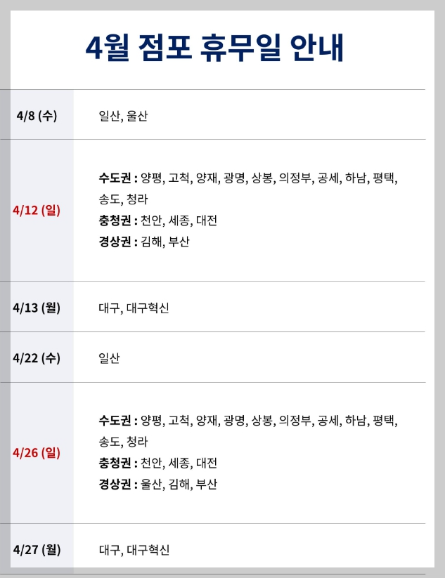 | 4/12(일) | 양평, 고척, 양재, 광명, 상봉, 의정부, 공세, 하남, 평택, 송도, 청라, 천안, 세종, 대전, 김해, 부산 | 휴무 점포가 많은 날 |